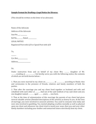 Sample Format For Legal Notice For Divorce
